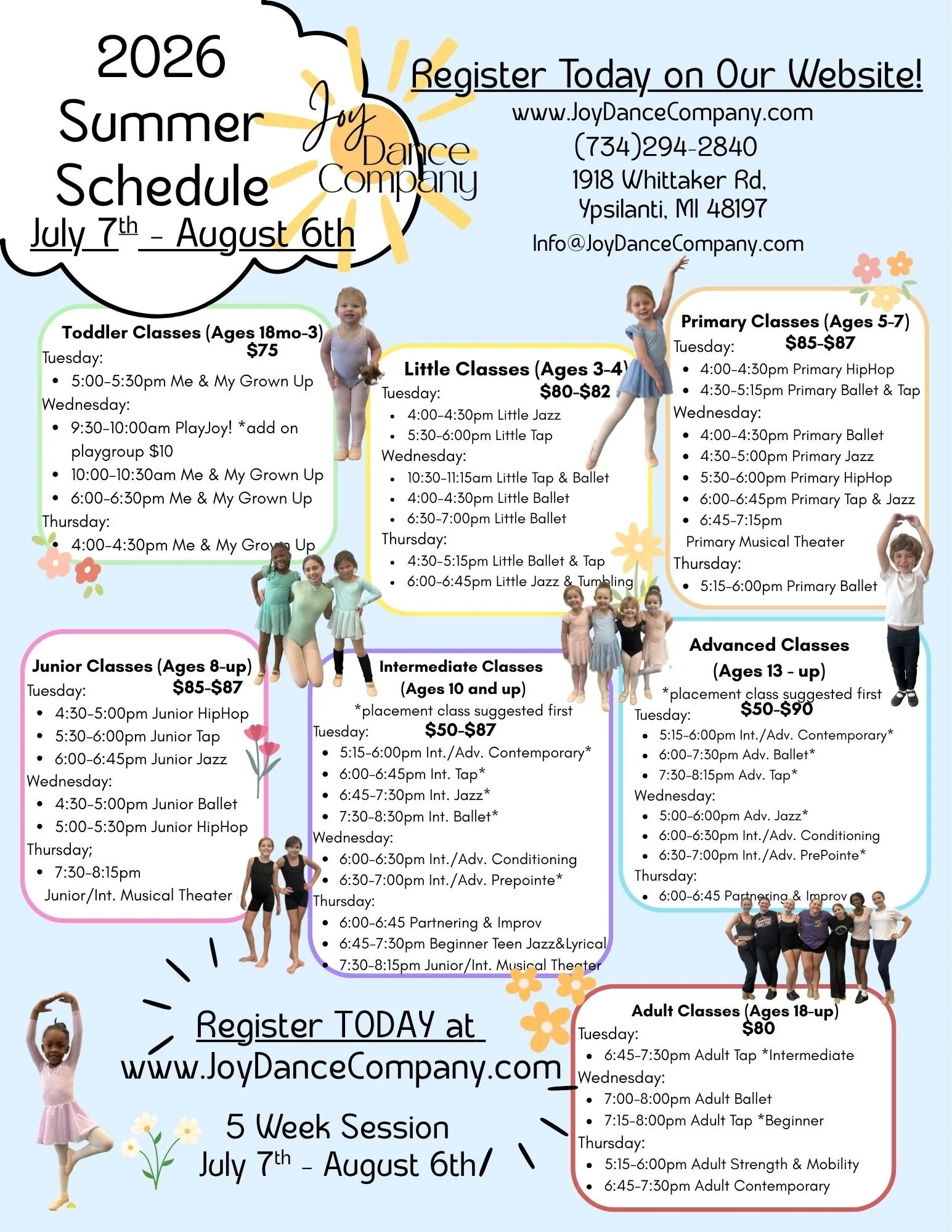 Summer Classes are a 5 week session running from July 7th through August 6th. This is a great time to keep your dancer moving, try a new class or two and keep them having fun during the summer!